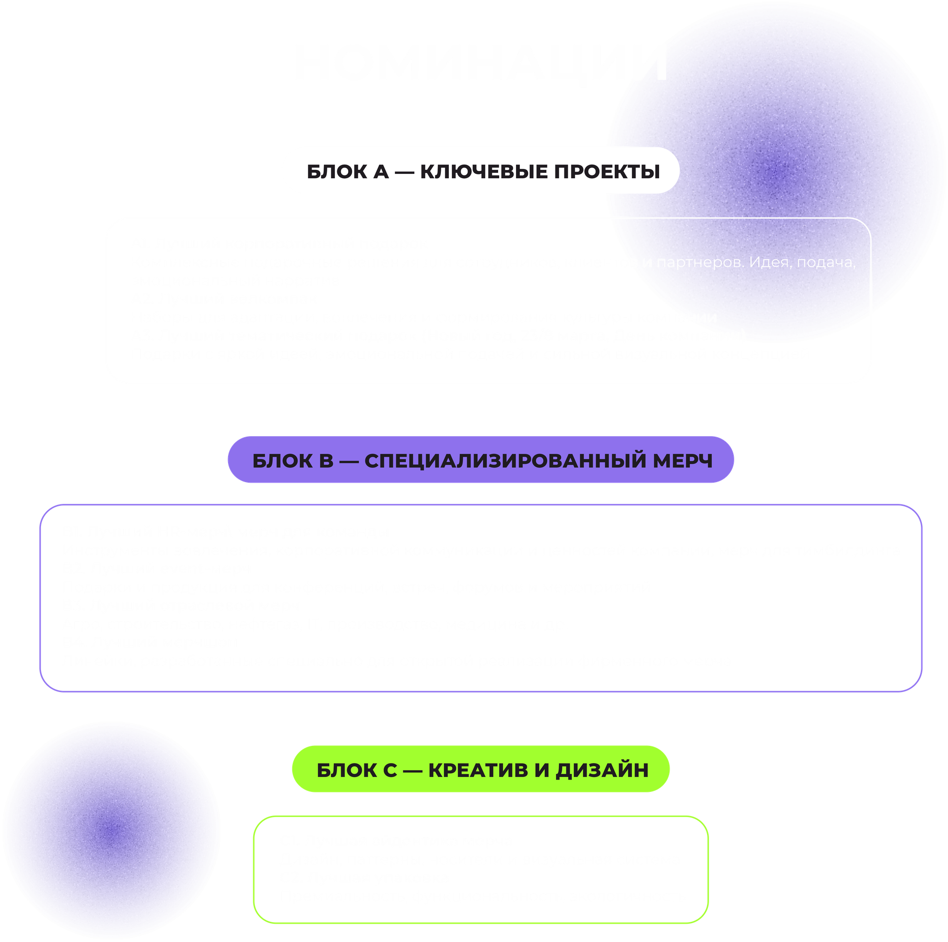 3.2. К участию принимаются проекты: — корпоративные подарки; — мерч для сотрудников; — ивент-мерч; — промо-решения;